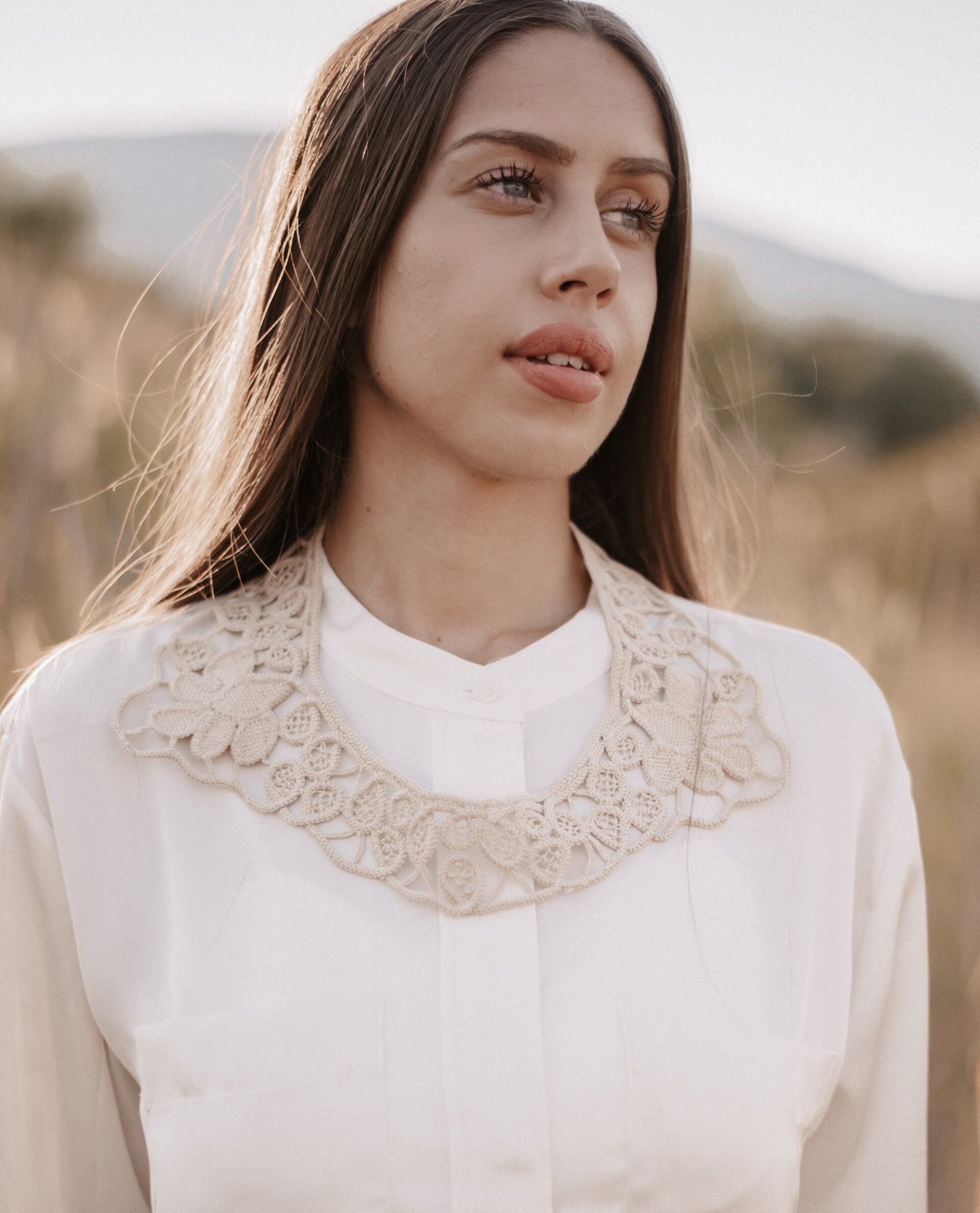 Our Dafina Collar is an accessory every bold woman needs in her wardrobe. Inspired by ancient times and beauty of Macedonia, Dafina Collar is handmade in cotton, and comes in beige color. The back is enhanced with original pearl from Ohrid Lake.