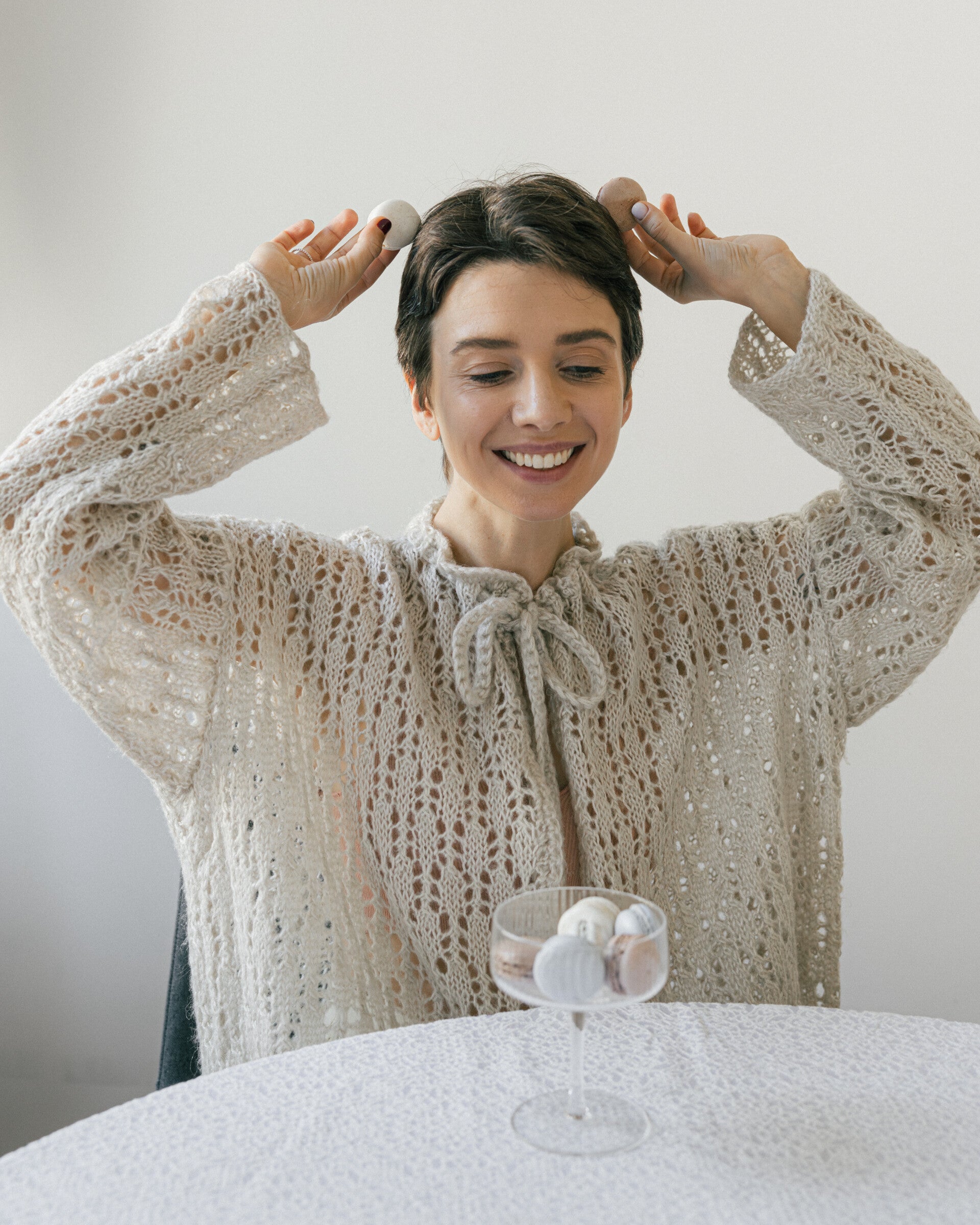 Wrap yourself in luxurious warmth and elegance with Jolie mohair and wool cardigan. Featuring an oversized fit, slightly oversized sleeves, and a delicate ribbon detail at the neck, it blends comfort with timeless sophistication.