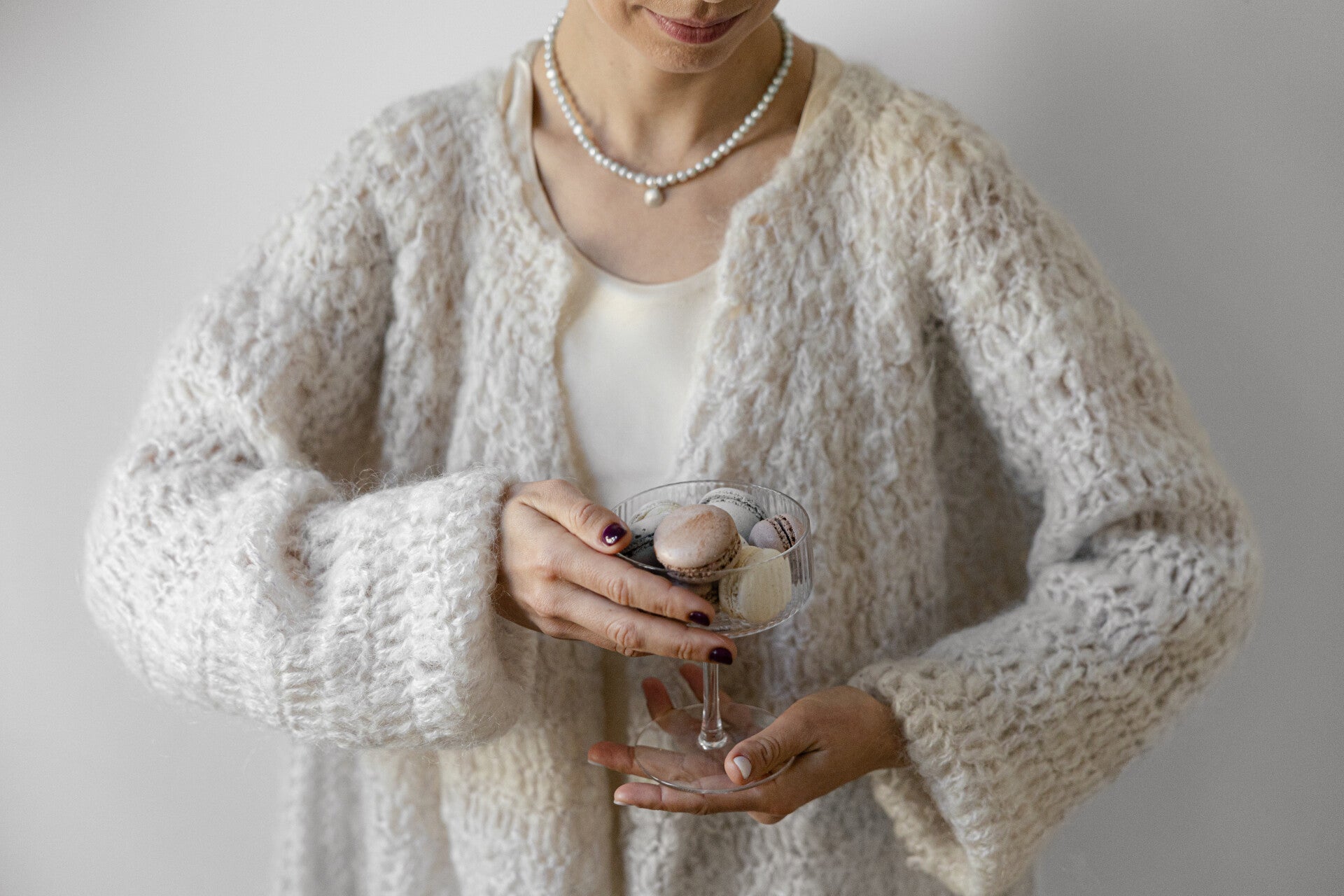 Trésor cardigan is crafted from mohair yarn and it is the perfect balance of elegance and everyday comfort. The luxurious mohair adds a refined texture and warmth, while the oversized fit keeps it relaxed and wearable for daily occasions. Its versatility makes it a staple piece in any wardrobe—whether you’re lounging at home or layering it over a dress or jeans for an effortlessly chic look.