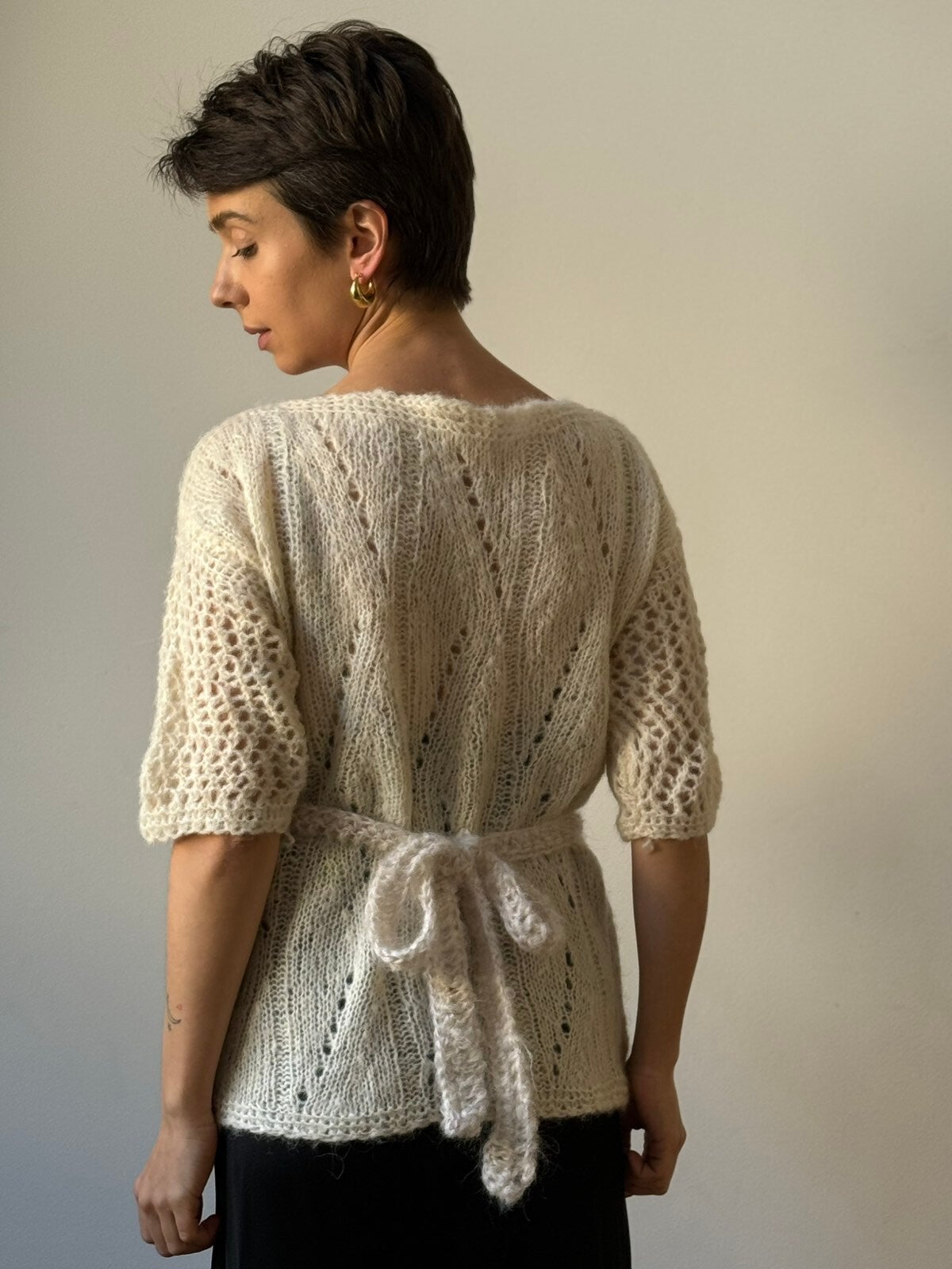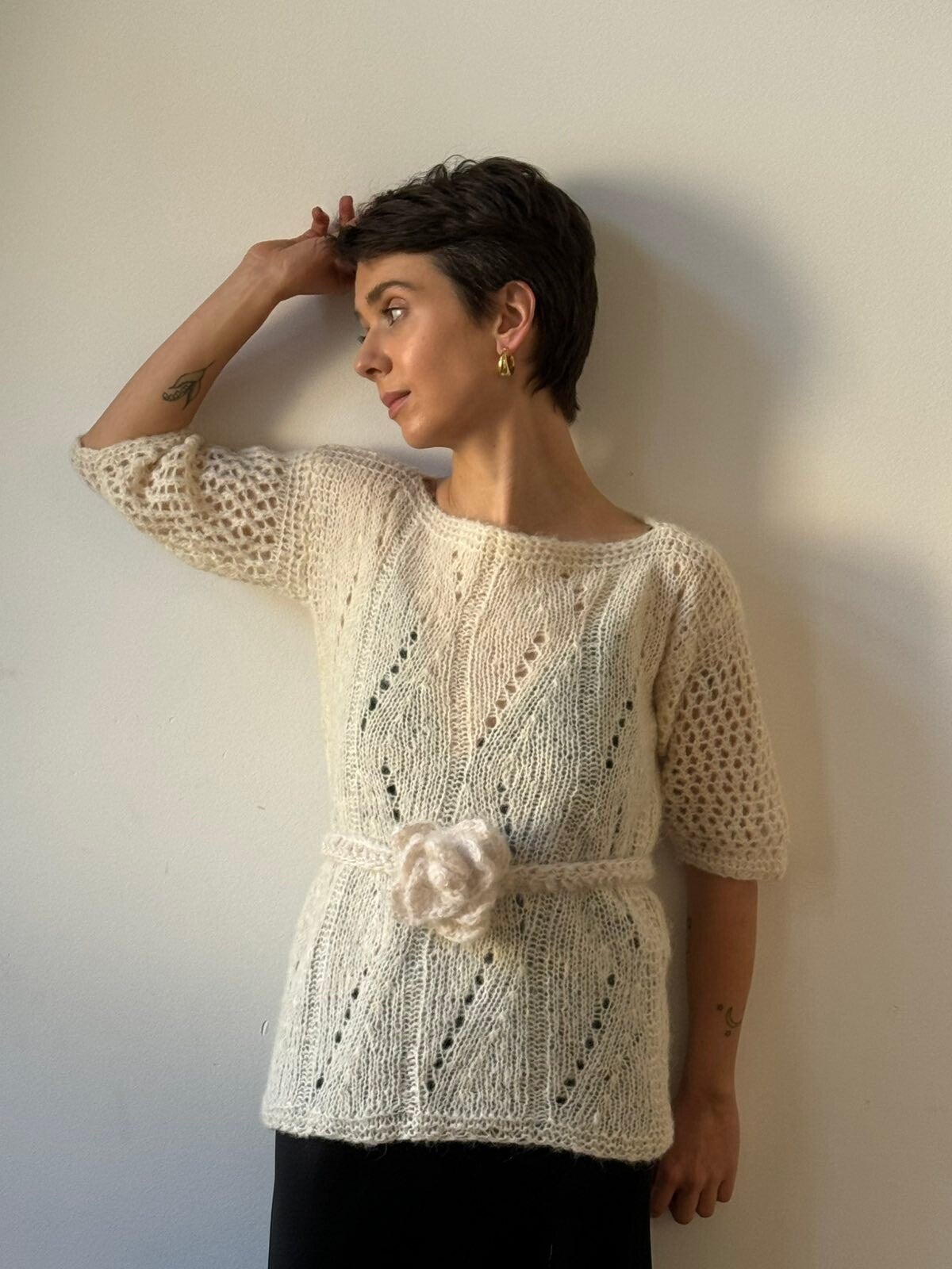 This off-white sweater combines elegance and comfort with its softest mohair yarn. Designed in a regular fit, it features short sleeves and a delicate net pattern for a touch of airy texture. The front and back are adorned with a unique knit design, adding a sophisticated and distinctive flair. For an extra touch of charm, the sweater comes with a removable rose belt, which can also be worn separately to style your look in various ways. Perfect for layering or wearing on its own, this piece offers both versatility and style.