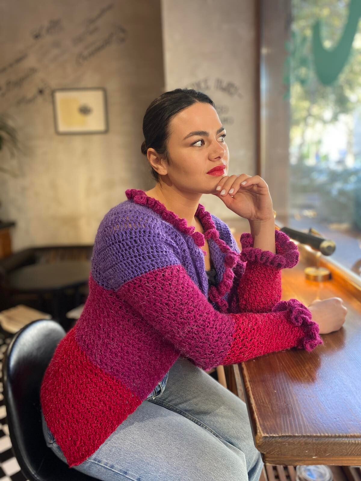 Angelina Cardigan feels like a warm hug. It features magenta pink and rich purple color. Made of 100% mohair.